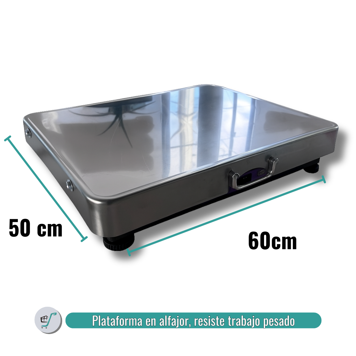 Construcción industrial de alto rendimiento Plataforma de acero inoxidable de 50 x 60 cm resistente a la corrosión y al desgaste intensivo. Su estructura robusta soporta hasta 600 kg manteniendo precisión constante en cada pesaje.