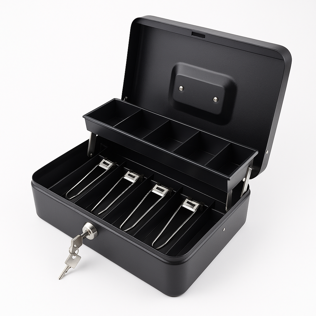 Con sus 30 x 24 cm de base y apenas 10 cm de alto, esta caja cabe perfectamente bajo un mostrador, en una gaveta o en tu bolso al ir al banco. Pero no te dejes engañar por su tamaño compacto: tiene capacidad real para un día completo de ventas.