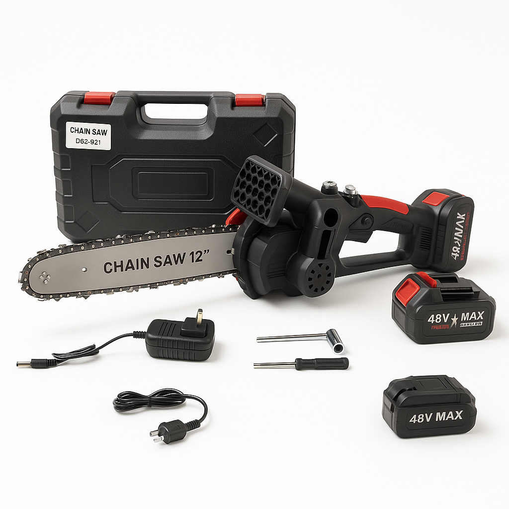 ¿Cansado de motosierras a gasolina que no arrancan, requieren mantenimiento constante y contaminan? ¿O tal vez necesitas hacer podas y cortes ocasionales pero no quieres invertir en equipos gigantes y ruidosos? La Mini Motosierra Eléctrica 12" con Batería 48V es la solución perfecta: combina la potencia de una sierra profesional con la practicidad de una herramienta portátil e inalámbrica.