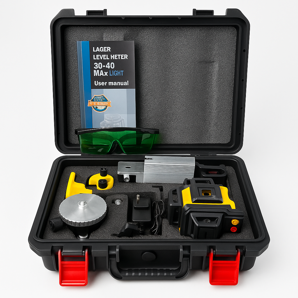 Nivel láser profesional 16 líneas con tecnología de autonivelación automática y precisión de ±2mm. Proyecta líneas horizontales y verticales 360° para cubrir toda la habitación. Incluye control remoto, receptor de señal, soporte magnético ajustable, base giratoria, trípode extensible, gafas de protección y maletín resistente. Ideal para construcción, instalaciones eléctricas, colocación de pisos/azulejos y trabajos de carpintería.